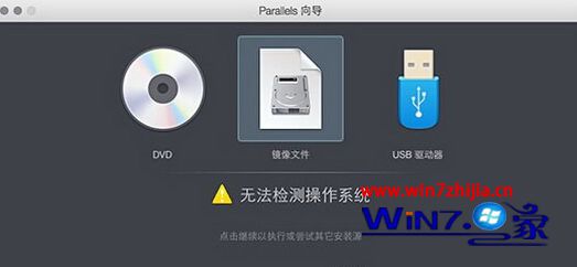 4、点击“手动查找”按钮,然后将win7的iso镜像文件拖动到parallels窗体中。它有可能无法识别win7,没关系,点击“继续”按钮。
