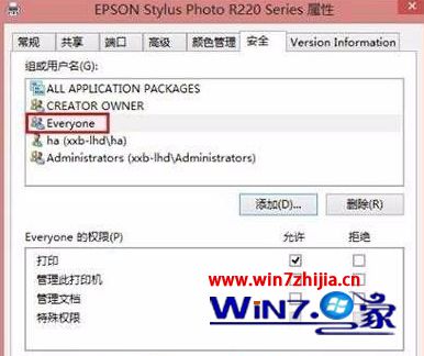 8、回到了打印机属性界面【安全】选卡中,在【组和用户名】下面选中“Everyone”,在下面权限框中将所有的选项都勾选“允许”,点击应用并确定,重启计算机即可。