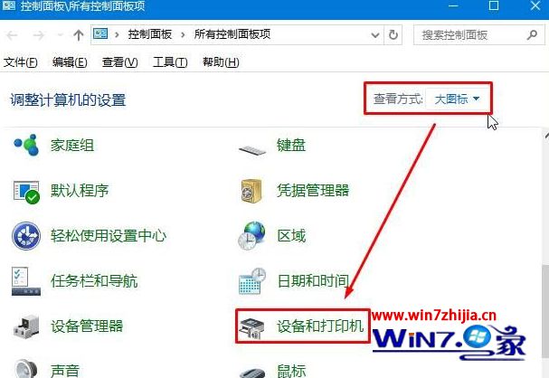 2、将查看方式修改为“大图标”,点击“设备和打印机”;