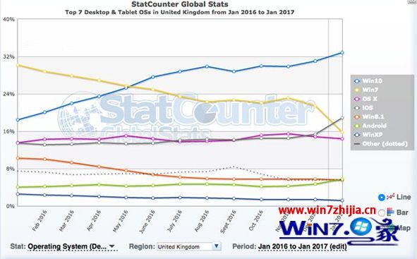 不过根据statcounter数据分析,现在英国win7市场份额达到6个月以来的最大份额记录,2017年1月初冲击到32.38%,相比12月份上涨1.69个百分点。同期,7年之久的windows7系统份额下滑到15.8%,下跌了5.67个百分点,ipad平板系统份额上涨到18.58%。