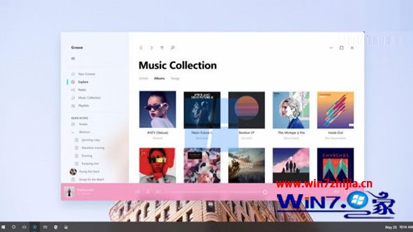 此外,Acrylic组件与Conscious Ui(意识型Ui)及Connected Animations(连接过场动画)互相补充,例如目前的最新win7创造者更新预览版中的《Groove音乐》已加入了某些此类Ui元素和过场动画效果,如下图: