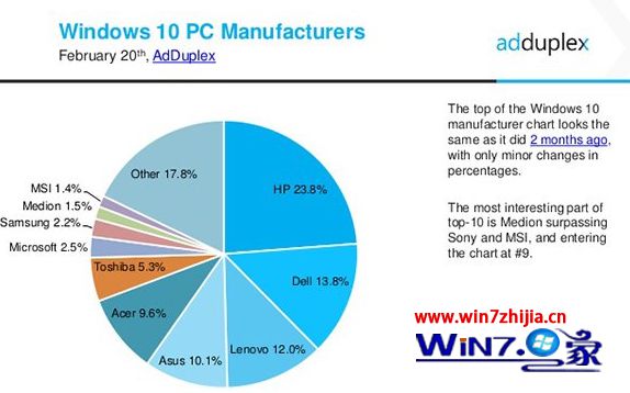 在win7电脑品牌占有率上,Hp惠普遥遥领先,占据23.8%的市场份额,戴尔和联想位列第二和第三位。微软排在第七位,市场占有率为2.5%。