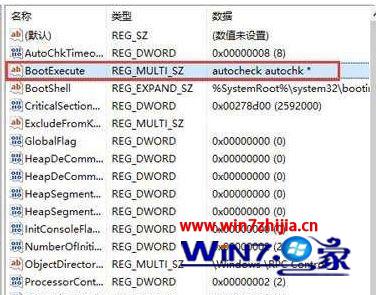 3、在其右侧找到“BootExecute”并双击打开 ;