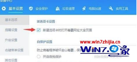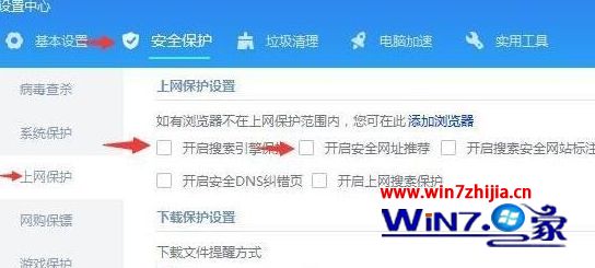 3、接着进入毒霸右上角的设置中心,选择“安全保护--上网保护”,把“搜索引擎保护”和“开启安全网址推荐”取消勾选。