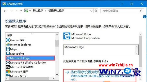 4、在程序框中选中“Microsoft Edge”,然后点击右侧的“将此程序设置为默认值”,点击确定即可。